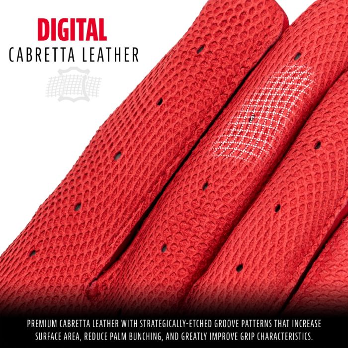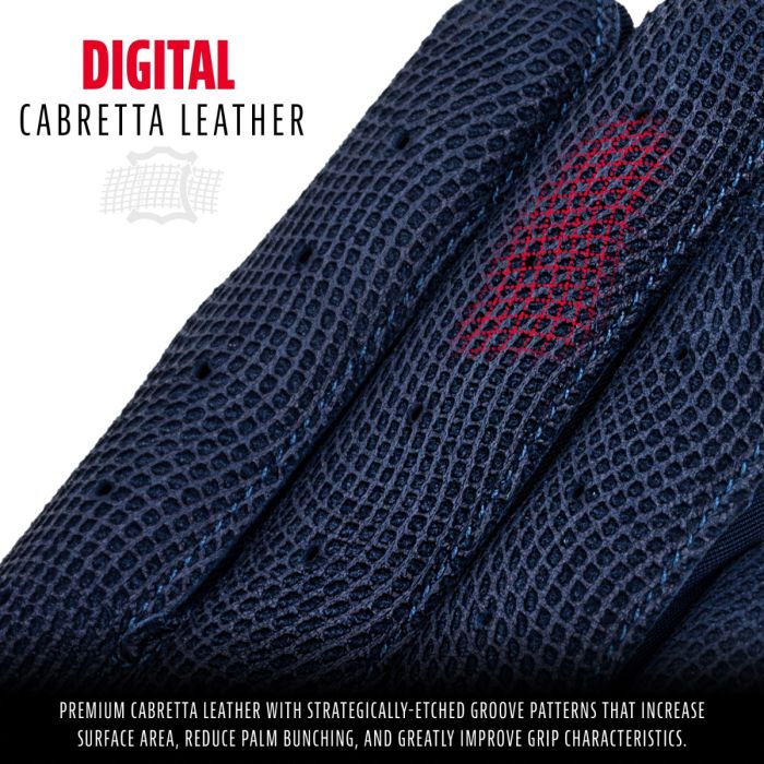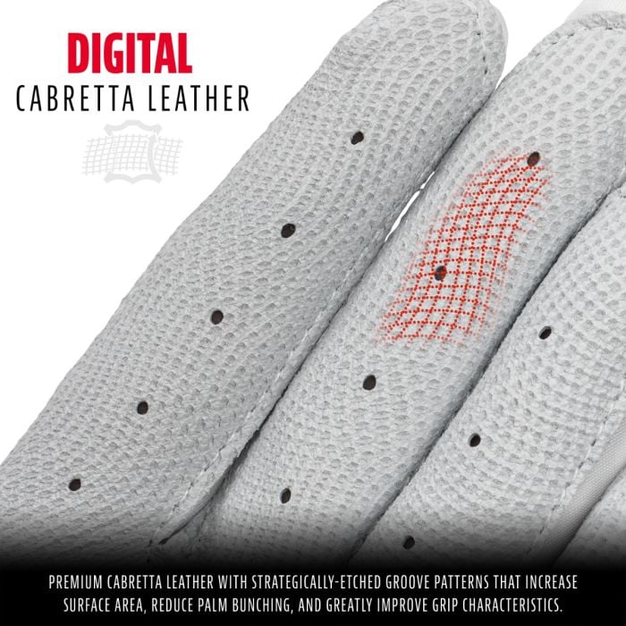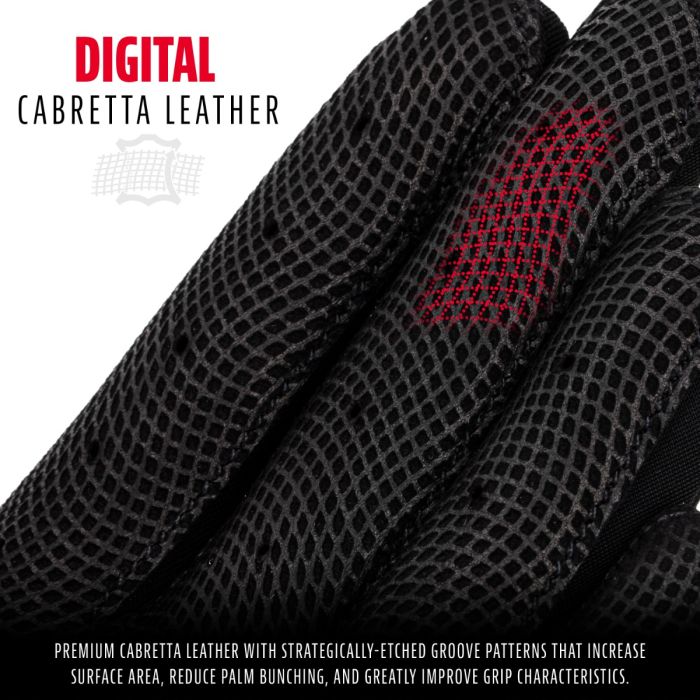 - DIGITAL CABRETTA LEATHER: Premium cabretta leather with strategically-etched groove patterns that increase surface area, reduce palm bunching, and greatly improve grip characteristics